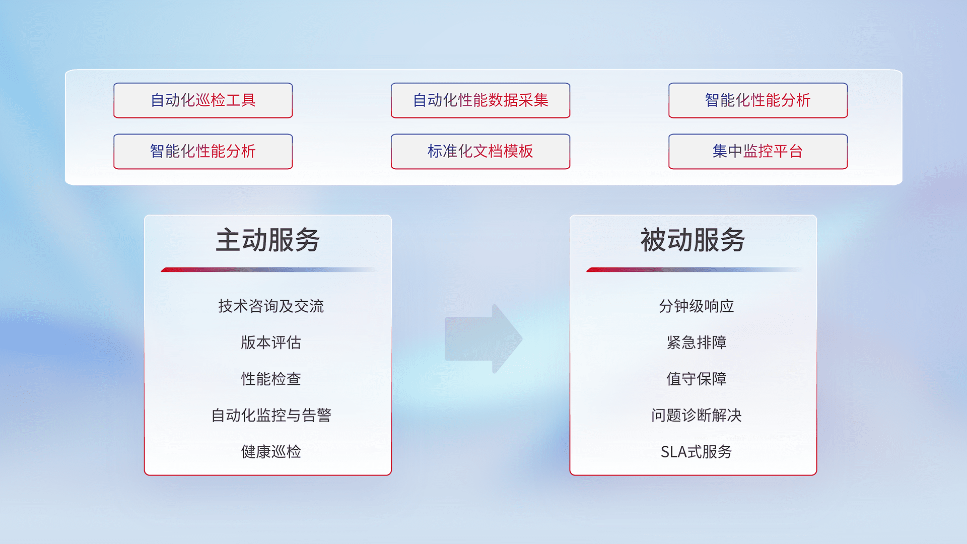智能化工具和标准化文档,,保障服务质量,,提供主动服务(包含技术咨询、、、版本评估、、性能检查、、、、自动化监控与告警、、、健康巡检)和被动服务包含(分钟级响应、、、、紧急排障、、值守保障、、、、问题诊断解决、、SLA服务)。。